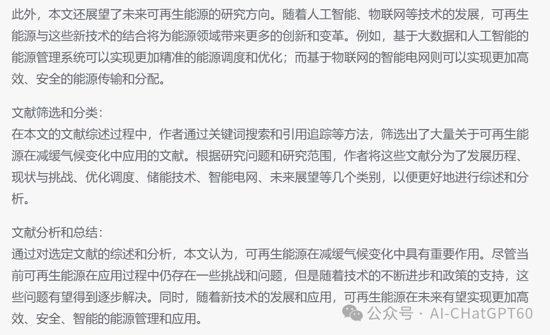 例如,你可以向ChatGPT发出指令:“请基于以上关于“可再生能源对减缓气候变化的影响”的参考文献进行总结,帮助我撰写一份文献综述草稿,重点关注可再生能源的应用。”ChatGPT将为你生成一份初步的文献综述草稿,供你参考和修改。