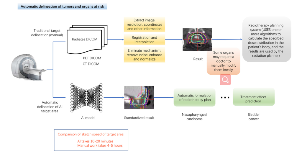 (人工智能在癌症放疗中的应用主要包括癌症靶区、危险器官的划定和放疗计划的自动制定。人工智能系统可以自动实现辐射图像的智能描绘,无需人工配准、插值等操作。此外,人工智能还可以根据绘制的器官和靶区直接预测三维剂量分布,从而实现更个性化的治疗自动化。)